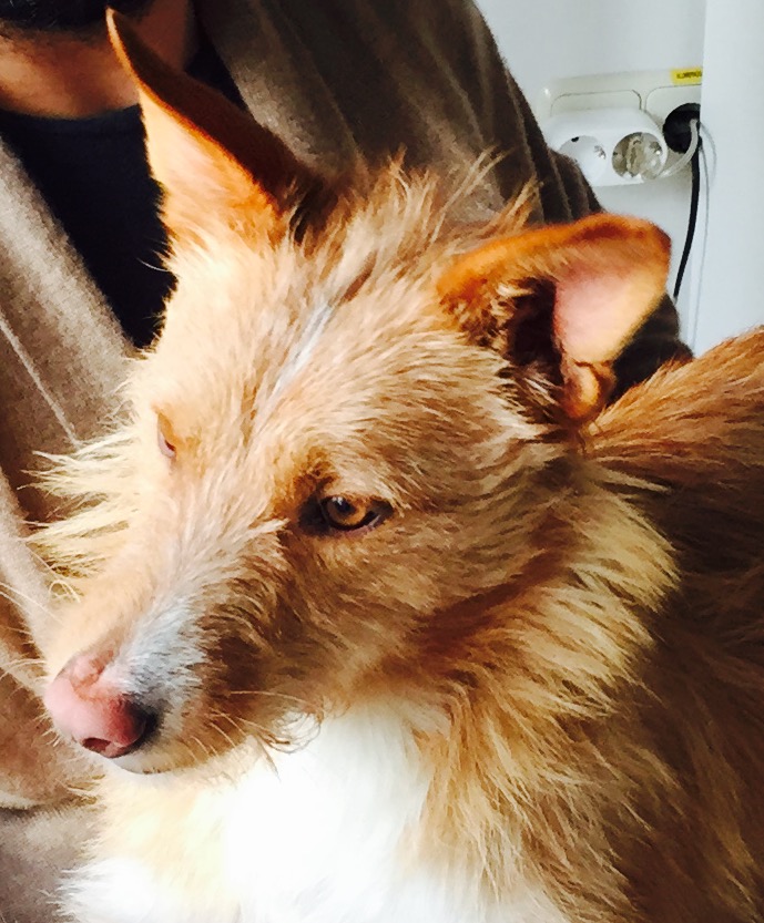 Rufo, es un auténtico can do palleiro, rubiajo, con ojos de color miel, ligero y elegante en sus andares y con una mirada que desarma. Rufo tiene unos amos, Loli y Pedro, pero vive prácticamente en la calle, a su aire,  libre para corretear por calles y prados, eso sí,  siempre que sus dueños estén en su casa. Cuando se van,  lo dejan atado con una larga cadena en la puerta, imagino que a requerimiento de alguna mamá de los niños que juegan en los columpios, que no quiere tener a Rufo por allí mientras ellos están en el parque. Muchas veces Román y yo  lo libramos de su cautiverio y nos lo llevamos un ratito de paseo.